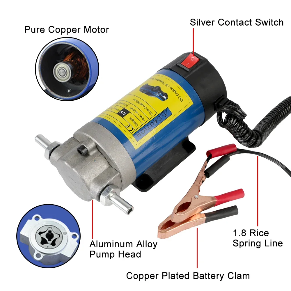 Насос обладнаний витовим кабелем із крокодилами для живлення від акумуляторної батареї автомобіля. А завдяки потужному двигуну здатний перекачувати до 4 літрів за хвилину, залежно від в'язкості та температури масла.